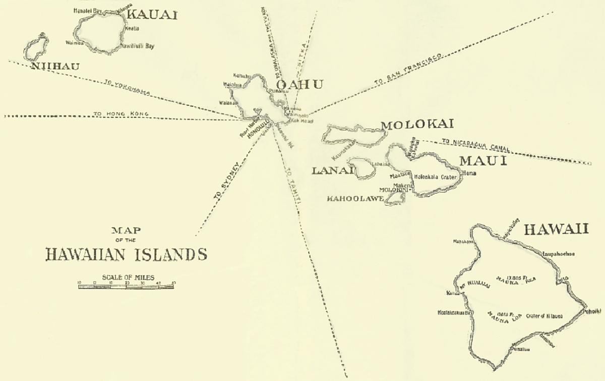 The Hawaiian Islands are situated in the North Pacific Ocean and lie between longitudes 154° 40' and 160° 30' West, and latitudes 22° 16' and 18° 55' North. They are thus on the very edge of the tropics, but their position in mid-ocean and the prevalence of the northeast trade wind gives them a climate unequalled by any other portion of the globe—a perpetual summer without an enervating heat. In the Hawaiian Islands Americans and Europeans can and do work in the open air, at all seasons of the year, as they cannot in countries lying in the same latitudes elsewhere. To note an instance, Calcutta lies a little to the north of the latitude of Kauai, our most northerly Island, and in Calcutta the American and European can only work with his brain; hard physical labor he cannot do and live. On the Hawaiian Islands he can work and thrive.