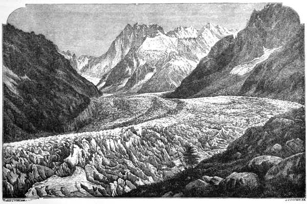 Glacier loaded along its edges by the ruins of the mountains; Lateral Moraines; Medial Moraines; their number one less than the number of Tributaries; Moraines of the Mer de Glace; successive shrinkings; Glacier Tables explained; 'Dip' of stones upon the glacier enables us to draw the Meridian Line; type 'Table;' Sand Cones; moraines engulfed and disgorged; transparency of ice under the moraines