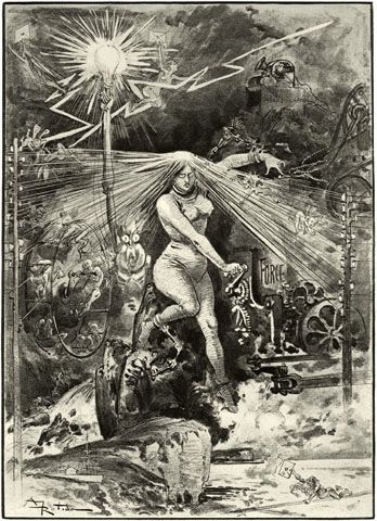 Elle est l'inépuisable foyer, elle est la lumière et la force; sa puissance captive est employée à faire marcher aussi bien l'énorme accumulation de machines colosses de nos millions d'usines, que les plus délicats et subtils mécanismes. Elle porte instantanément la voix d'un bout du monde à l'autre, elle supprime les limites de la vision, elle véhicule dans l'atmosphère l'homme, son maître, la lourde créature, jadis ridiculement attachée au sol comme un insecte incomplet.