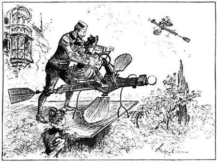 Quand on vit le danger, il y eut dans la foule des aéronefs une bousculade fantastique pour chercher un abri à terre. Le millier de véhicules s'abattit à toute vitesse en une masse confuse et enchevêtrée où les accidents d'abordage furent nombreux et souvent graves. La tournade, arrivant en foudre, balaya tout ce qui n'eut pas le temps de fuir; il y eut des aéronefs désemparées, emportées dans le tourbillon et précipitées en quelques secondes à cinquante lieues de là; par bonheur, dans ce désastre, les grandes aéronefs portant les membres de l'Aéronautic-Club et leurs familles étaient pourvues du nouvel appareil réunissant l'électromètre et les tubes de gaz isolateur à une soupape automatique; l'appareil s'ouvrit de lui-même dès que l'aiguille marqua danger et les aéronefs, enveloppées dans un nuage protecteur, fortement secouées seulement, purent regagner l'embarcadère du club.