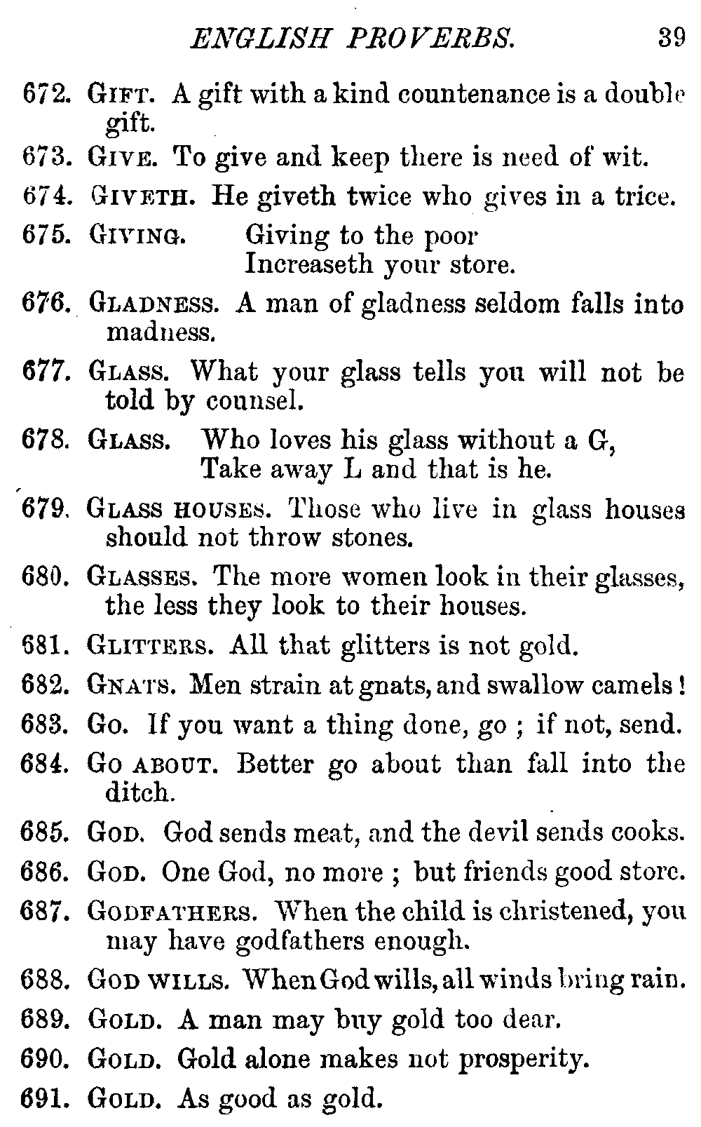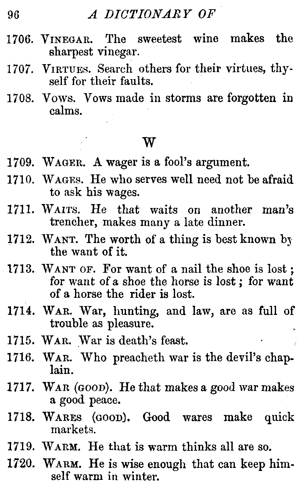 The late Earl Russell very aptly described a proverb as "The wisdom of many and the wit of one." We value proverbs chiefly as moral maxims teaching some practical lesson set forth in concise, pithy sentences, which are fixed in the memory without effort, and retained without being burdensome. They have been found useful for guidance in almost every condition of life; but, on the other hand, it is quite true that many dangerous precepts have been propounded in proverbs, and some of the older ones [vi]gave such questionable advice, or were couched in such objectionable language, that they have been very properly omitted from every collection intended, as this is, for general use. Other old proverbs have become obsolete, and as their meaning is now obscure, they have not been included in the Dictionary.