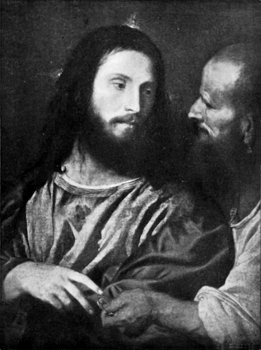 In his best works Titian’s sense of the dramatic holds the golden mean between conventionality and sensationalism. In the group of sacred personages surrounding the Madonna and Child there is sufficient action to constitute a reason for their presence,—to relieve the figures of that artificial and purely spectacular character which they have in the earlier art,—yet the action is restrained and dignified as befits the occasion. The pose of both figures in the Christ of the Tribute Money is in the highest degree dramatic without being in any way theatrical. The tempered dignity of Titian’s dramatic power is also admirably seen in the Assumption of the Virgin. The apostles' action is full of passion, yet without violence; the buoyant motion of the Virgin is unmarred by any exaggeration.