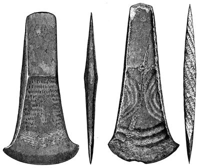 Terms, “the Recipient” and “the Received”—Evolution from Palstaves—With [x]“Flanches,” or curved Lines, on the Faces—Plain, with a Beading round the Mouth—Of a Gaulish type—With vertical Ribs on the Faces—With Ribs ending in Pellets—With Ribs and Pellets on the Faces—With Ribs and Ring Ornaments—Variously ornamented—Of octagonal Section—With the Loop on one Face—Without Loops—Of diminutive Size—Found in Scotland—Found in Ireland—Comparison with Foreign Forms—Mainly of Native Manufacture in Britain—Those formed of Iron 107