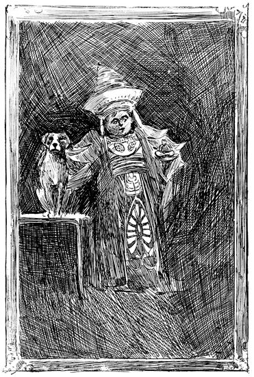 The “Little Baron,” so called from his diminutive stature, was born some time in the latter part of the seventeenth century. He was the last of his race in the direct line, although cousins of his are to-day well-known Pomeranian gentry. He began his travels at an incredibly early age, and filled his castle with such strange objects picked up here and there in the far away corners of the world, that the simple-minded peasantry came to look upon him as half bigwig and half magician—hence the vigrowth of the many myths and fanciful stories concerning this indefatigable globe-trotter. The date of his death cannot be fixed with any certainty; but this much may be said: Among the portraits of Pomeranian notables hanging in the Rathhaus at Stettin, there is one picturing a man of low stature, and with a head much too large for his body. He is dressed in some outlandish costume, and holds in his left hand a grotesque image in ivory, most elaborately carved. The broad face is full of intelligence, and the large gray eyes are lighted up with a good-natured but quizzical look that invariably attracts attention. The man’s right hand rests upon the back of a dog sitting on a table and looking straight out with an air of dignity that shows that he knew he was sitting for his portrait.