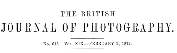 The Project Gutenberg EBook of The British Journal of Photography, No. 613, Vol XIX, February 2, 1872, by Various This eBook is for the use of anyone anywhere in the United States and most other parts of the world at no cost and with almost no restrictions whatsoever. You may copy it, give it away or re-use it under the terms of the Project Gutenberg License included with this eBook or online at www.gutenberg.org. If you are not located in the United States, you'll have to check the laws of the country where you are located before using this ebook. Title: The British Journal of Photography, No. 613, Vol. XIX, February 2, 1872 Author: Various Release Date: January 17, 2019 [EBook #58708] Language: English Character set encoding: UTF-8 *** START OF THIS PROJECT GUTENBERG EBOOK BRITISH JOURNAL OF PHOTOGRAPHY, FEB 2, 1872 *** Produced by The Online Distributed Proofreading Team at http://www.pgdp.net (This file was produced from images generously made available by The Internet Archive)