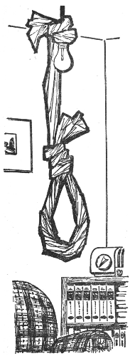The apartment is called a single. It contains a Murphy bed, a chest of drawers, an overstuffed chair, a sofa, a coffee table, a seventeen-inch television set, a bookcase partially filled with the volumes A through F of an encyclopedia from the supermarket, assorted paperback books, and a radio that doesn't work. In the ceiling is a fixture with two twenty-five-watt bulbs. A short hallway leads to the bathroom and the kitchen.