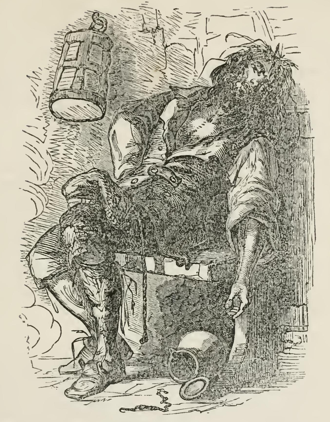 The stranger took off his hat, and disclosed the hard features of a man of sixty or thereabouts, much weatherbeaten and worn by time, and the naturally harsh expression of which was not improved by a dark handkerchief which was bound tightly round his head, and, while it served the purpose of a wig, shaded his forehead, and almost hid his eyebrows. If it were intended to conceal or divert attention from a deep gash, now healed into an ugly seam, which when it was first inflicted must have laid bare his cheekbone, the object was but indifferently attained, for it could scarcely fail to be noted at a glance. His complexion was of a cadaverous hue, and he had a grizzly jagged beard of some three weeks’ date. Such was the figure (very meanly and poorly clad) that now rose from the seat, and stalking across the room sat down in a corner of the chimney, which the politeness or fears of the little clerk very readily assigned to him.