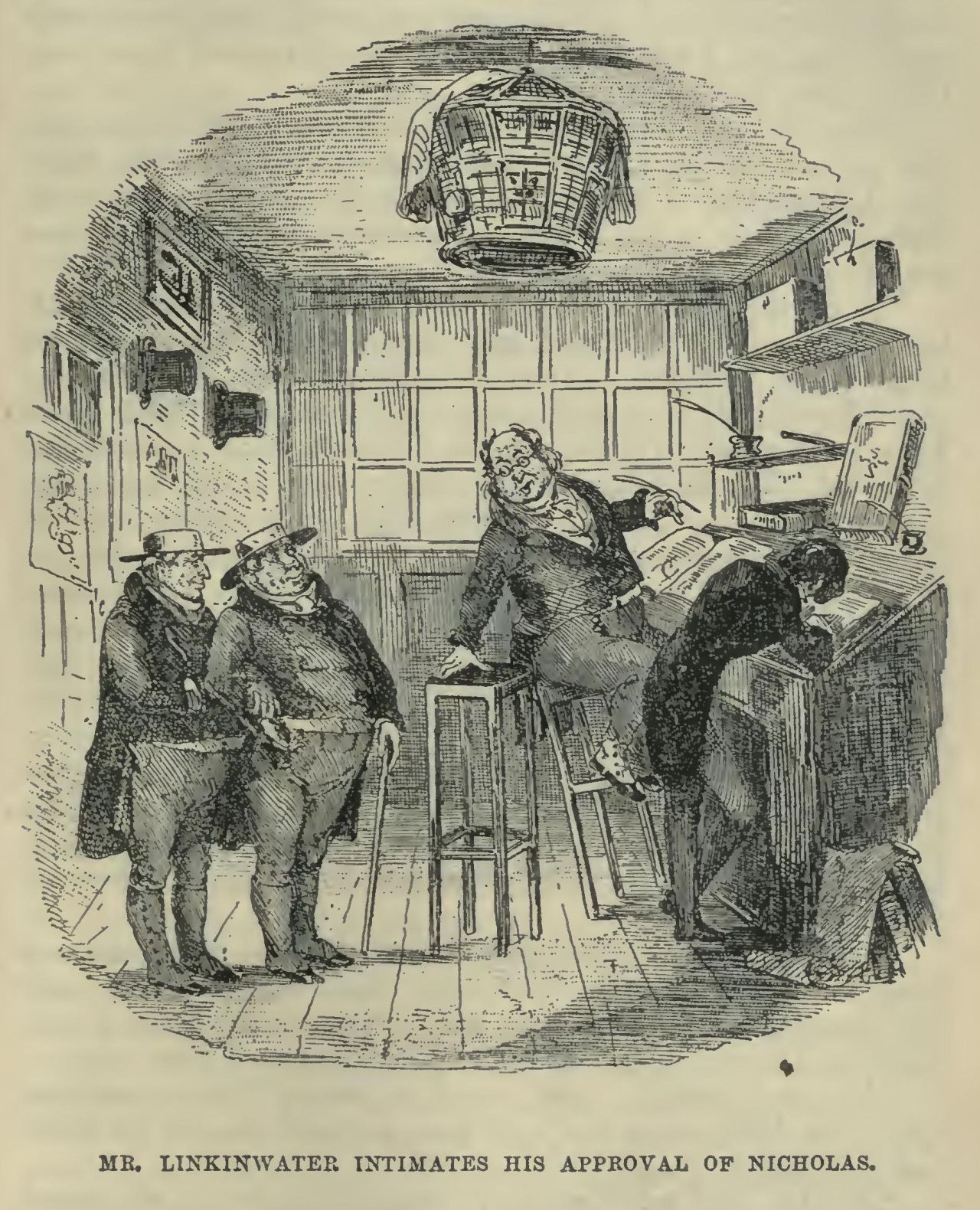 Mr. Ralph Nickleby was not, strictly speaking, what you would call a merchant, neither was he a banker, nor an attorney, nor a special pleader, nor a notary. He was certainly not a tradesman, and still less could he lay any claim to the title of a professional gentleman; for it would have been impossible to mention any recognised profession to which he belonged. Nevertheless, as he lived in a spacious house in Golden Square, which, in addition to a brass plate upon the street-door, had another brass plate two sizes and a half smaller upon the left hand door-post, surrounding a brass model of an infant’s fist grasping a fragment of a skewer, and displaying the word ‘Office,’ it was clear that Mr. Ralph Nickleby did, or pretended to do, business of some kind; and the fact, if it required any further circumstantial evidence, was abundantly demonstrated by the diurnal attendance, between the hours of half-past nine and five, of a sallow-faced man in rusty brown, who sat upon an uncommonly hard stool in a species of butler’s pantry at the end of the passage, and always had a pen behind his ear when he answered the bell.