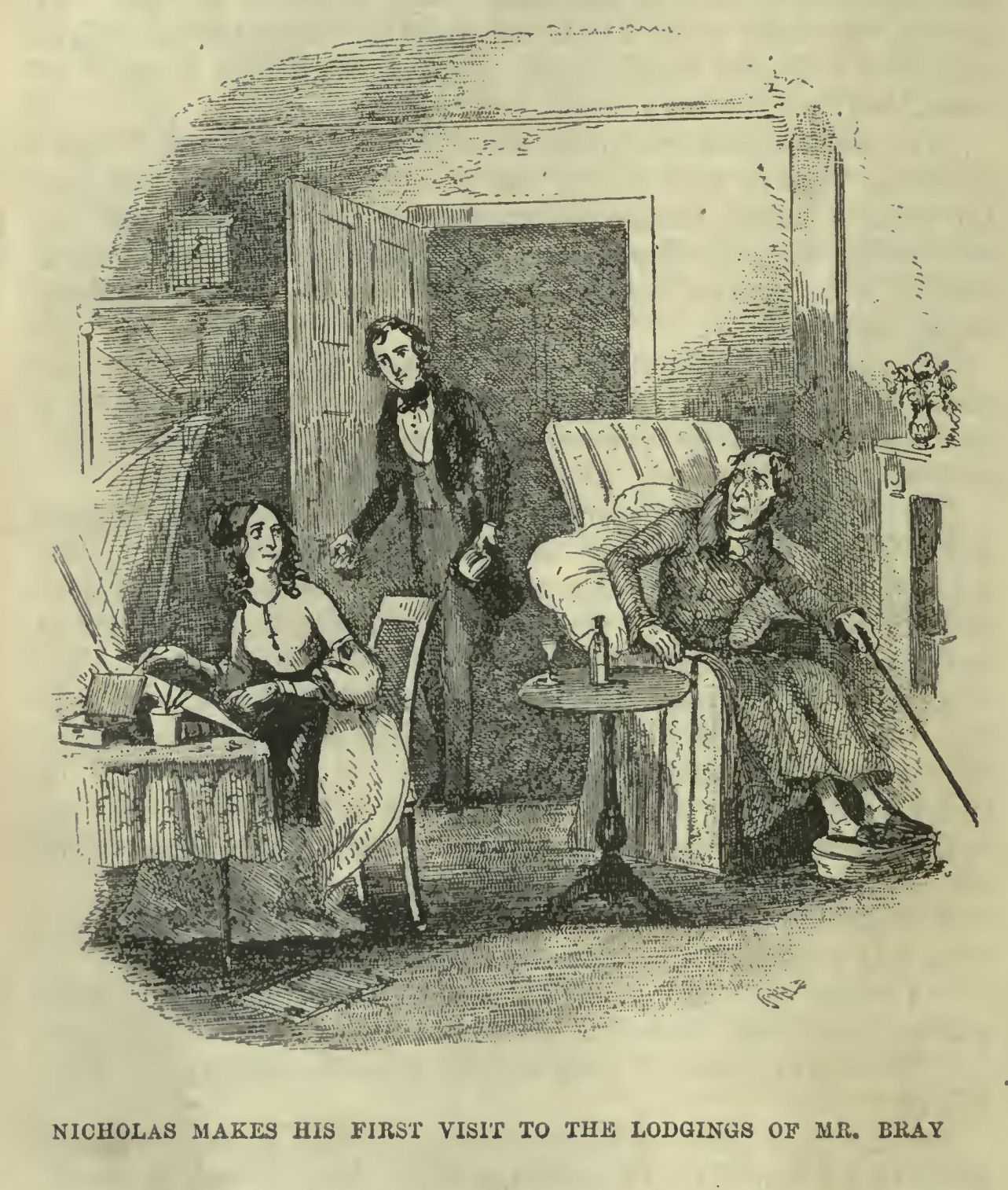 Some ill-conditioned persons who sneer at the life-matrimonial, may perhaps suggest, in this place, that the good couple would be better likened to two principals in a sparring match, who, when fortune is low and backers scarce, will chivalrously set to, for the mere pleasure of the buffeting; and in one respect indeed this comparison would hold good; for, as the adventurous pair of the Fives’ Court will afterwards send round a hat, and trust to the bounty of the lookers-on for the means of regaling themselves, so Mr. Godfrey Nickleby and his partner, the honeymoon being over, looked out wistfully into the world, relying in no inconsiderable degree upon chance for the improvement of their means. Mr. Nickleby’s income, at the period of his marriage, fluctuated between sixty and eighty pounds per annum.