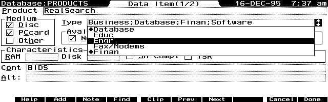 Likewise, if you wanted to develop a DataBase program, you could use a third generation language such as TIPI, or C/C++ and eventually get the job done. With the 4GL language built into the DataBase engine, you merely fill out a form on the screen by picking options from a menu. You can add fields for Text, Numbers, Group Boxes and Option Buttons, a Category and a Note field merely by picking these field types from a dialog box. You can then move and re-size the fields on the screen with the arrow keys. When you're satisfied with the appearance of the "form", you press (F10) [Done] and the 4GL takes over and creates a custom DataBase program for you.