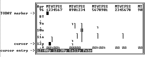 The vertical lines in the Monthly Graph View displayed on the next page show the time slots that are filled. The time intervals are set to one half hour (the dots between the hours are the half-hour indicators). These settings can be changed using the configuration file option. The TODAY marker keeps you aware of today's date. (The block cursor you see is created by a third party utility I use.) In the screen below I moved the cursor down to the item occupying the 12:00 pm slot on April 2 to see what's there. Its contents show up in highlighted text at the bottom of the screen.