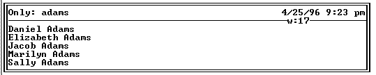 Note that the text searched on is displayed in the upper left corner. A highlight bar rests on the first match (Daniel Adams). I can use the ArrowKeys to move the highlight bar to any match. When I press (ENTER), Flexpad displays the entire text file in Text View and puts the cursor on the line I selected in the Only View. So if I selected Daniel Adams and pressed (ENTER), Flexpad would take me to the section of my text file with that line, allowing me to review or edit my contact information on Daniel.
