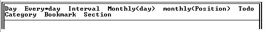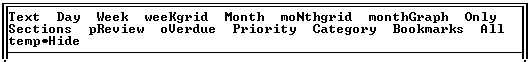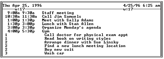 In the above Day View screen, the date of the appointments and ToDo's is displayed in the upper left corner, above its week number. The system date (i.e., the current date), time, and week number are displayed in the top right of the screen. Then come the appointments for the selected date, sorted by time, followed by incomplete ToDo's for that date or earlier, sorted by priority. Hitting (H) hoists the first ToDo to the top of the screen, and hitting (H) again hoists the first appointment to the top (similar to toggling between (F9) and (F10) in Appointment).