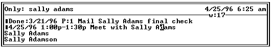 While talking to Sally, she asks me about a check I was supposed to send her. I press (F4) to return to the Previous View (which brings up the Only View on sally adams') and note the date associated with the first entry (i.e., the completed ToDo telling me to send the check). She asks to change the time of our meeting, so I press (F3) (Day) to return to the Day View and see if there's an alternative time to meet her today.
