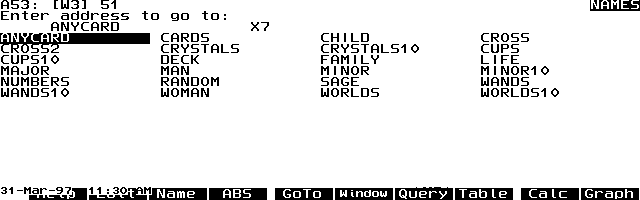 My spreadsheet with different charts and tarot spreads has become a little unwieldy. To navigate I simply press (F5) (goto) (F3) (name) (F3) (list). A list of range names such as "deck" and "anycard" appears, and I point to the one I want to jump to. (See Screen 14.)