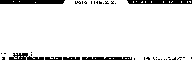 Unfortunately, early experimentation has yielded PCX images that aren't of good enough quality given the detailed full-color imagery of the Voyager deck. Other tarot decks would be better suited. Storing the card's image in the database is valuable because of the importance of what the visual symbology and imagery evoke. The use of 6K PCX graphic files associated with databases has much promise in other reference and learning material.