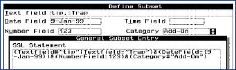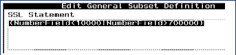 To see what a typical SSL statement looks like we'll use the subset definition in which the Number field has <10000,>700000 in it. If you press F6(subset) and then press F4(Edit) you'll see the "Edit General subset Definition" window. In the SSL Statement field you should see (NumberField<10000 | NumberField >700000) as in Screen 3.