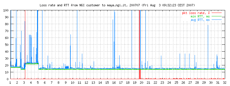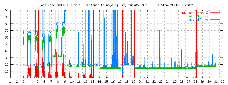 Apart from the trivia on the Telecomitalia technical support, the graphs below contain RTT and loss data over a number of months, and also a picture of the carrier state on my particular DSL line, which is affected by an annoying noise that regularly appears at 5.45 and disappears at midnight. See the full graphs.
