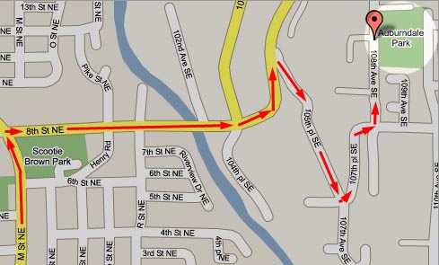 Parking is along the street, against the fence of the park, on 108th Ave SE. Do not park in front of the gate because parks and recreation employees may need access while we are playing.