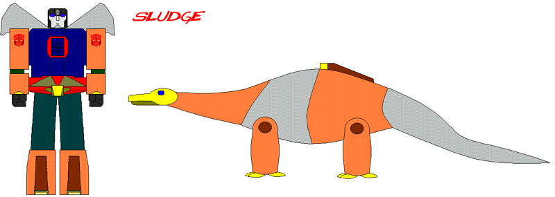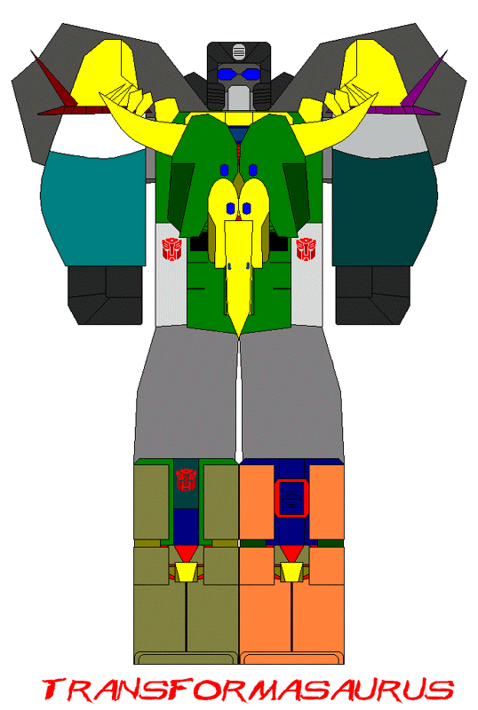 4. "Transformasaurus" - the big guy, the unified form of all the dinobots,kinda based on grimmys' robot mode as you can see swoop is his hips grimlock his chest slag and swivel his arms and snarl and sludge his legs/feet (62k, 3-4-01)