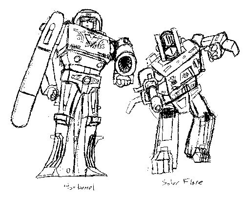 4. Hot Barrels and Solar Flare - (BW pencil sketch) These fraternal Decepticons tag-team as a stationary artillery cannon and target finding jet, or they can merge to form a mobile assault jet. They appear in my "Decepticons, Attack!" fan concept. (74k, 8-1-00)