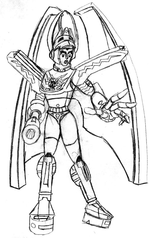 1. Optima Prima - (B/W pencil sketch) A female olympian mortally damaged in an alien invasion during the Cybertronian Games is refashioned to become this Autobot leader. (91k, 12-1-00)
