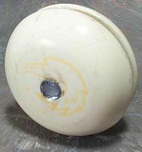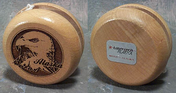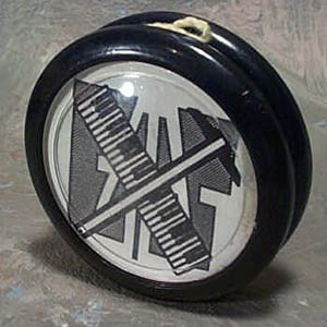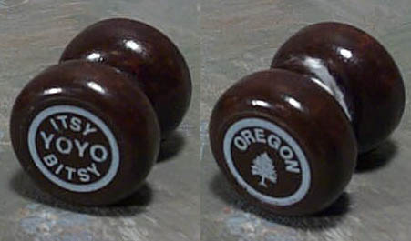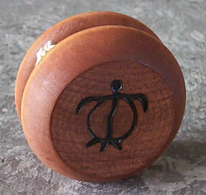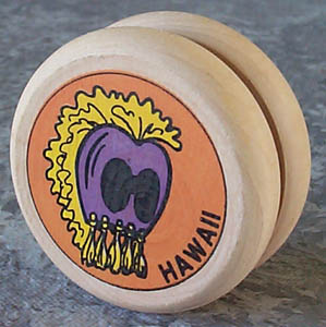 * - "Hawaii" - wood yo with a Hawaiian ceremonial helmet design of some kind. Doesn't really play, since the sctring is embedded in the axle, and will not allow the yo to sleep. Pretty design, though.