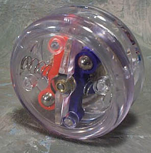 *** - Strobe-Yo - Yomega transaxle design, but with LEDs in the rims, one on each side. The LEDs turn on when you touch a contact on either side of the yo, and ramain on as long as you play. They can be turned off by pressing an internal button with a special pin, or allowed to turn off automatically after a few minutes at rest. It plays ok, but it's pretty heavy, and the light aren't as impressive as the one below. With a hefty price tag around $40, it's a hard sell to anyone but a collector.