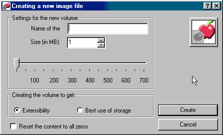 Specify the name of the future CD-ROM and the size of the partition. For little partitions like this one, both options of creation are alike. Check the 'Reset the contents to zeros' if you want to clean the contents of the virtual disk (which is created on your PC hard disk and could pick up the contents of older, deleted files). Click on the 'Create' button to start the process.