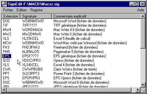 Cette table est stockée dans ce que nous appelons un fichier de signatures (en fait, un simple fichier de texte portant l'extension *.sig). Pour éditer ce fichier, vous pouvez l'ouvrir dans un éditeur de texte (la structure est très simple) ou bien utiliser le module d'édition qui est intégré dans MacDisk ainsi que MacImage (lancement depuis le menu 'Spécial' ou 'Options').