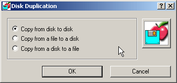 It may happen that somebody gives you a removable disk that you'll have to send to a service provider, like a service bureau. In this case, you would like to keep a copy of the disk. MacDisk offers three duplication options: disk to disk, file to disk and disk to file.