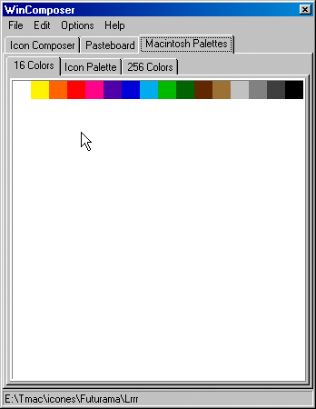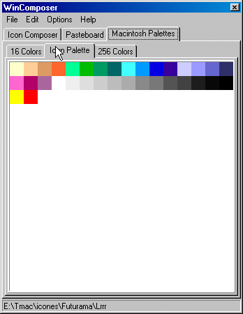 The Macintosh Palettes tab is mainly informative. It displays the three system palettes used on the Macintosh. Against what is done in Windows icons (*.ico files) or more generally in Windows bitmap files (*.bmp files), Macintosh icon files in 16 and 256 colors (4 bits/pixel and 8 bits/pixel) don't contain their own palette, but refer the Macintosh system palettes. There are three such palettes: