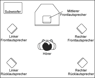Empfohlene Lautsprecherpositionen für eine 5.1-Lautsprecherkonfiguration.