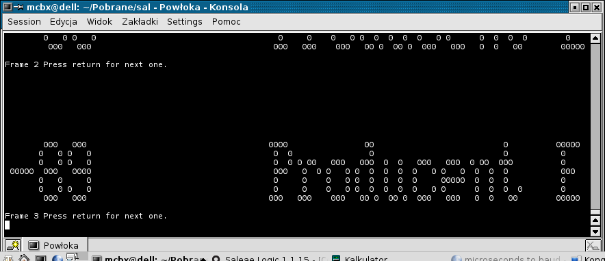 If we've loaded 8 lines - let's display them. Remember about inversion - lit LED is represented as LOW, so ones have been replaced by spaces. It looks nice in a console: