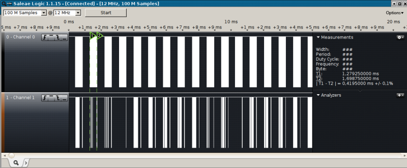 We can see that channel 0 (connected to DIN pin 3) recorded a series of pulses while the channel 1 (connected to DIN pin 1) got only few changes. It means that: