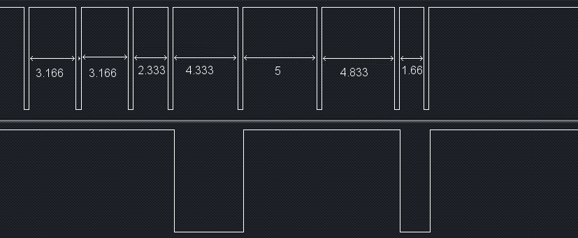 After few normal 3.166us bits, we have an unusial 2.333us interval, then 4.333us, 5us, 4.83us, and a very short 1.66us. CPU must be doing something in the end, something different than transmitting bits. Maybe it needs additional memory access for 4.4, 5 and 4.83 bits, and the last one is some way computed? These time differences are usually ignored by 74... logic chips, but for reverse engineering they have meaning. Generally, it means that...