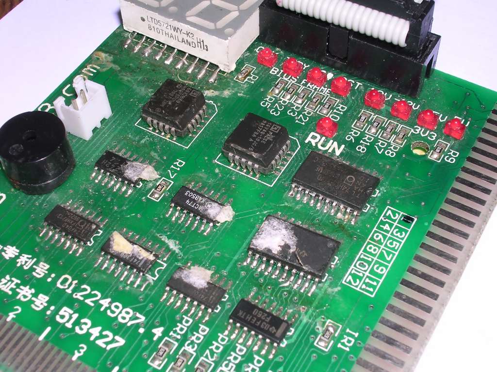 solder side with solder flux. These boards are made to show, on 7-segment display, a BIOS POST code. Before the failing system beeps for help, it puts codes for successive POST tests on a system bus. The board is made to capture and display these signals as well as states of some lines on bus. Another display can be connected on a ribbon cable to improve visibility. The problem with this board is quality. It is awful. |