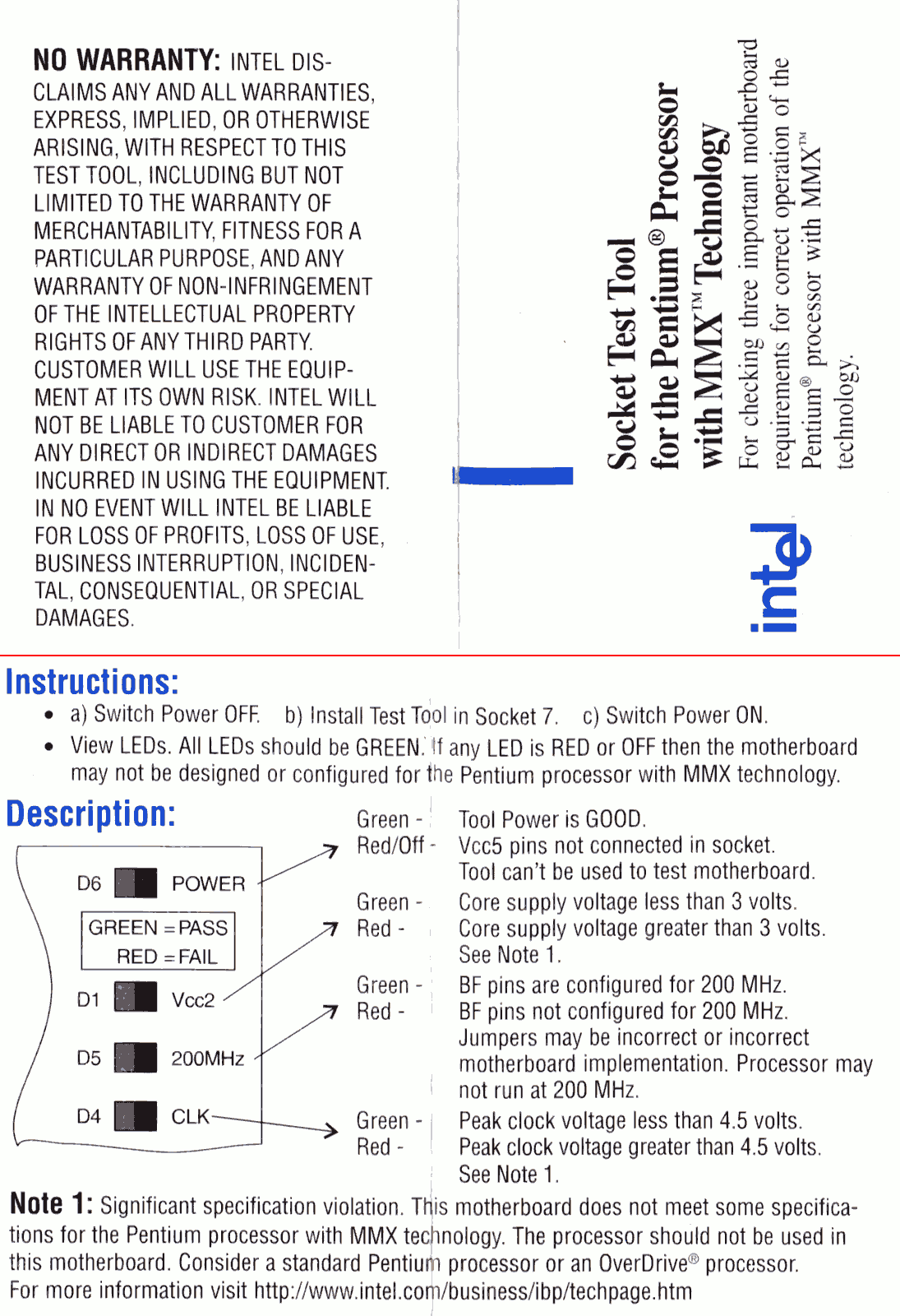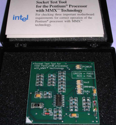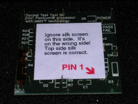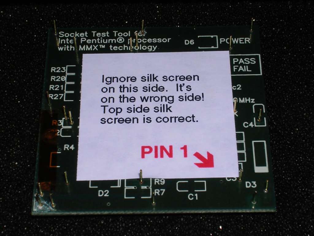 | Information: In second half of 1990s Pentium processors became more and more popular. Contrary to 486 boards, Pentium ones were made using a variety of chipsets utilizing totally different technologies. It was not easy to predict what processors are supported by what mainboard and manufacturers information was scarce after releasing board. For computer manufacturers needs, Intel released some testing tools to test will the mainboard run the specific Pentium processor. This one is for Pentium MMX - checks whether core voltage is proper, are the settings configured for 200MHz and is clock amplitude proper. It is inserted in socket and mainboard is started. The result can be read with green or red LEDs. This tool is professionally made mostly with SMD technology, but one interesting thing can be spotted on its bottom. |