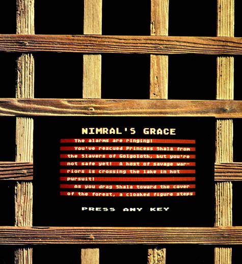 As promised last month, here's the sequel to The Slave Cellars of Golgoloth, and if you thought just rescuing the princess was tough, wait until you try to find out who's trying to put her six feet under. Yep, Slave II: Nimral's Grace is a mystery, and in order to be successful in your attempt to bring the would-be assassin to justice, you're going to have to search high and low for ten vital clues. Only when you've gathered all the evidence, will you be able to put the culprit behind bars.