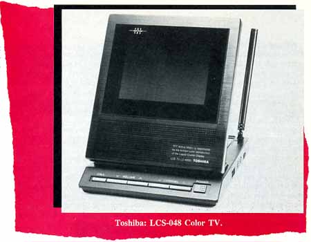 Toshiba announced and showed a new 4-inch color LCD television called the LCD-048. The high-resolution screen incorporates an active filter matrix with a thin-film transistor color filter that provides a bright, clear image. Resolution is 220 vertical by 480 horizontal lines.