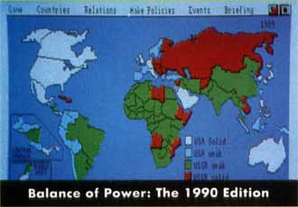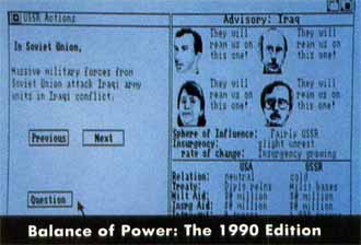 Finally, Chris Crawford's award-winning simulation, Balance of Power, gets a revamping in Balance of Power: The 1990 Edition. In this version, you choose to become the president of the United States or the general secretary of the U.S.S.R. In either case, it's up to you to find the right balance between power and diplomacy in order to gain global prestige and avoid nuclear holocaust. According to Mindscape, "Balance of Power: The 1990 Edition includes an updated database covering 1989 to 1997, additional countries, an on-screen advisory council to help resolve diplomatic crises and a much-requested multipolar level, which allows even minor countries to make foreign-policy decisions." Retail price: $49.95.
