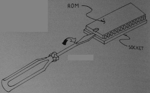 To remove a ROM, first insert the blade of the small screwdriver under one end. Turn the screwdriver back and forth to raise the end of the ROM slightly as shown in Figure 1. Now insert the blade of the screwdriver under the other end and raise that end slightly. Patiently repeat the above procedure raising each end a little more each time until the ROM is free of the socket.
