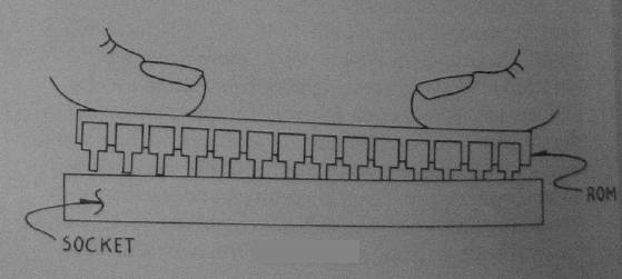 Before a ROM can be inserted into its socket, it may be necessary to straighten some of the pins. This should be done with the ROM inserted in the black foam, with the bent pins barely hanging over one edge of the foam. This allows you to straighten them while they are still in contact with the foam. Or you can straighten the pins while the ROM is inserted through several layers of aluminum foil. If the pins on the ROM are pointing outward too much to fit into the socket, bend them inward just enough so they will fit. Bending them any further increases the probability that a pin will get bent under the ROM when you try to insert it.