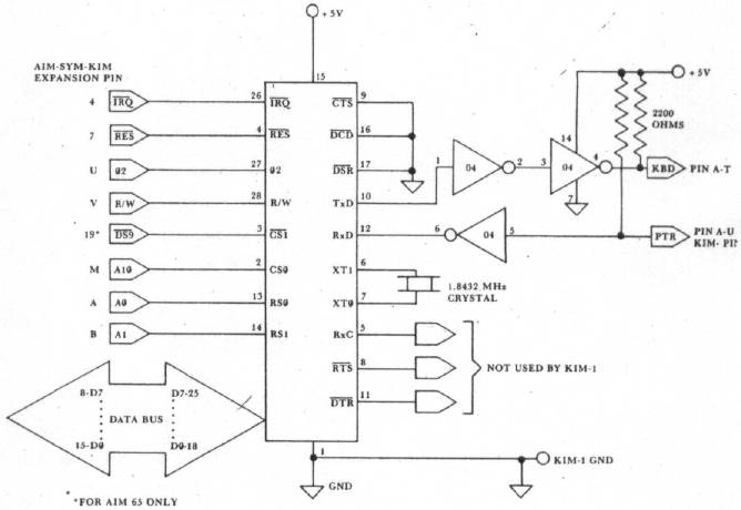 Since I was not familiar with this chip, I decided to do some simple experiments with it to supplement the meager (in my opinion) information supplied by the specification sheets from Rockwell and Synertek. In particular, I decided to use my AIM 65 microcomputer as a smart terminal for a KIM-1, operating the latter in its "teletypewriter" mode. Although this may seem ridiculous, the idea might be useful in a laboratory where various student stations have a KIM-1 that is used for experiment control or data acquisition. If all the KIM-1s were connected to a central terminal, one could load a program into all of them simultaneously or, with the appropriate switching circuitry, one could collect and process data from each of them. In any case, the experiment taught me what a KIM-1 is like when operated in its TTY mode rather than from its keypad, and more importantly, I learned some things about the 6551 ACIA.