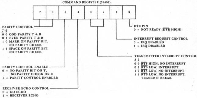 Refer to Figure 3 to identify the meaning of the various bits in the command register, and refer to Figure 4 to identify the meaning of the bits in the control register. The function of these registers will become apparent when we describe the program to uSe the AIM 65 as a terminal to control the KIM-1. In short, they allow the user to program the 6551 to operate under a large variety of conditions.
