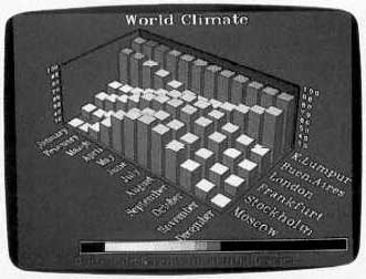 Perspective Junior operations are dynamic: Any changes you make to a graphic's underlying data are immediately reflected in the graphic itself. This dynamic interaction greatly simplifies the process of creating and editing a Perspective Junior graphic. When you finish entering your initial information into the program's Data Manager, for example, pressing the Escape key returns you to the top-level options screen and replaces the original sample graph with one that reflects your data table's current contents. If you then return to the Data Manager, edit the data table's contents, and go back again to the top-level screen, Perspective Junior automatically revises the current graph to reflect these changes. Similarly, pressing the F1 function key to access the Graph Type option and select a different type of graph causes Perspective Junior to immediately redraw your screen using the new graph type. Refining a Perspective Junior graph or chart is such a simple procedure that there's a chance you'll go overboard: Try not to enhance a graphic to such a degree that form obscures content.