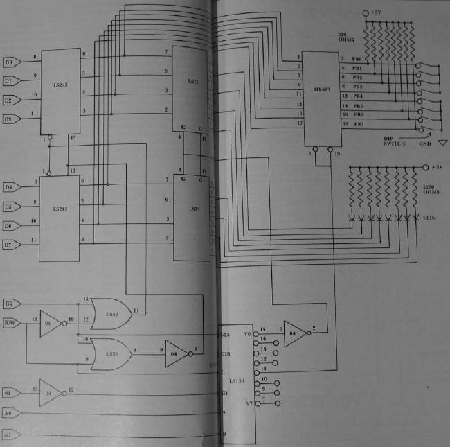 For the unfortunates who do not have a copy of COMPUTE! #8, I have included the circuit diagram of the peripheral I/O card in this article. It is shown in Figure 1. My circuit was wire wrapped on a Vector Electronic #4609 plugboard which fits into the peripheral card connectors on the Apple II. For the purpose of this application, the eight LEDs and the DIP switch (with pull-up resistors) are not needed. They are only used if you wish to use the peripheral I/O board in conjunction with the experiments in my book. You may also wish to experiment with the possibility of omitting the 74LS242 bus transceivers and the associated logic, simplifying the circuit further. This would leave only the 74LS138, an inverter, the two 74LS75s, and the 81LS97. Since only one bit of the input port is used to interface to the printer, you may wish to replace the 81LS97 with a 74LS125. I used the circuit as it is shown in Figure 1, with the DIP switch removed from the socket.