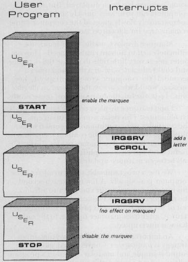Figure 1 shows the structure of a user program which invokes the marquee generator. The user program can activate the marquee by calling STOP. When the marquee is active, periodic interrupts divert the computer's attention from the user's program (left column) to the interrupt service routines (right column).