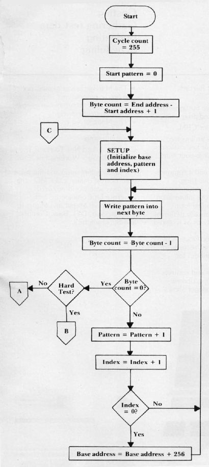 At this point, the microprocessor enters the actual write loop. It starts by writing a pattern into memory, decrementing the byte count, then checking whether test memory has been entirely filled with test patterns (byte count = 0). When the byte count is zero, the microprocessor branches to the read/ verify loop, at either its soft error test or hard error test entry point; path A or path B, respectively. Otherwise, pattern and index are incremented, in preparation for writing to the next byte.