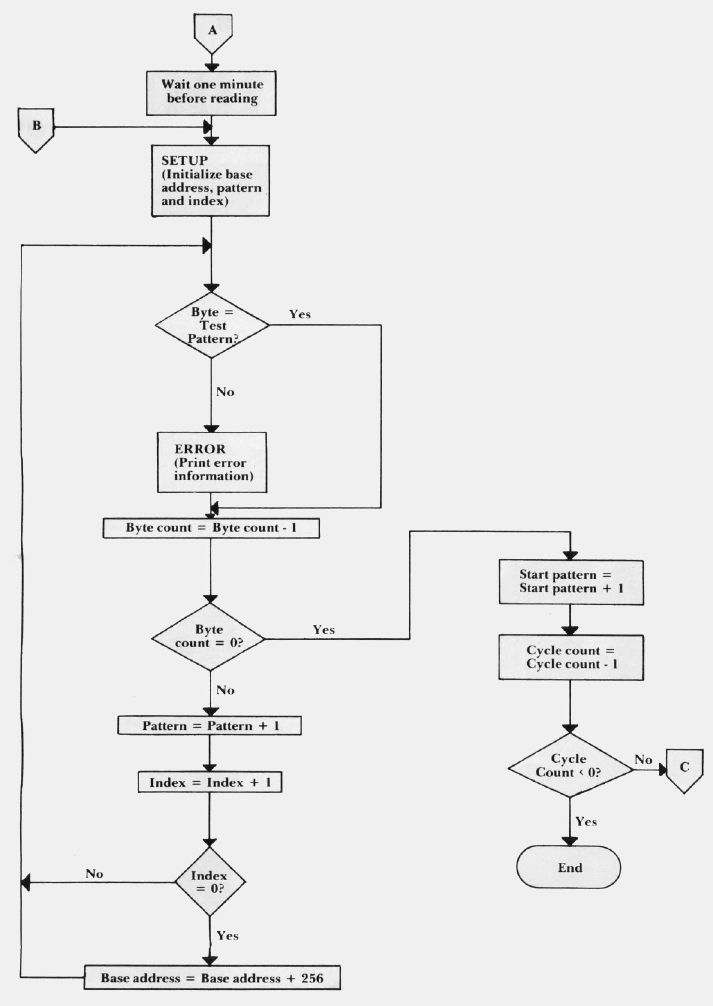 As expected, the sequence of the read/verify loop (Figure 2) is very similar to that of the write loop. However, the read/verify loop has two separate entry points, one for soft error testing (in which the loop is preceded by a one-minute time delay), and the other for hard error testing. The read/ verify loop begins with a call to the SETUP subroutine, to fetch the starting test pattern and reinitialize the base address and index.